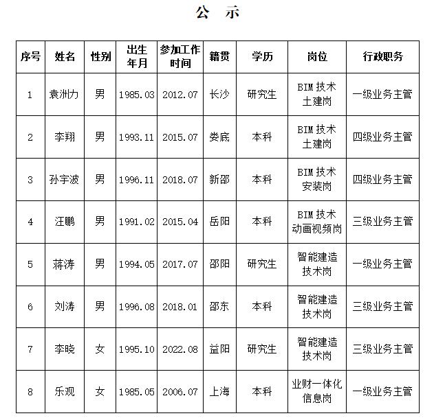 公司于2025年5月23日在公司官網(wǎng)對智能建造中心9名工作人員錄用情況進(jìn)行了公示,試崗期3個月,現(xiàn)8名同志試崗期考核通過、1名同志試崗期考核未通過。結(jié)合考核情況,根據(jù)公司相關(guān)規(guī)定,經(jīng)公司黨委研究,決定對袁洲力等考核通過的8名同志行政職務(wù)進(jìn)行公示。